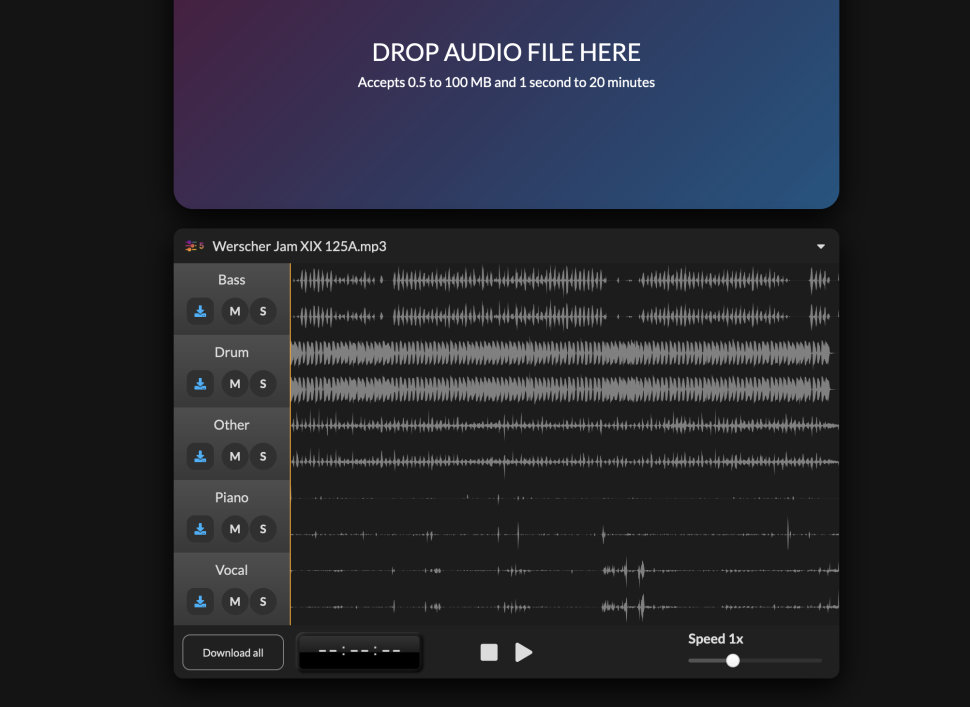 In den Heft-Downloads zum Mastering-Spezial in Beat-Ausgabe 12/23 findest du eine passende Aufnahme, die wir polieren wollen: eine Live-Session von unseren Autoren Daniel und Marco. Alternativ kannst du natürlich aber auch einen eigenen Track verwenden. Mit etwas EQing, einem Stereo-Expander und Limiter lässt sich hier zwar schon was erreichen, aber richtig rocken tut’s nicht. Also brauchen wir Einzelspuren und die holen wir uns bei Splitter.