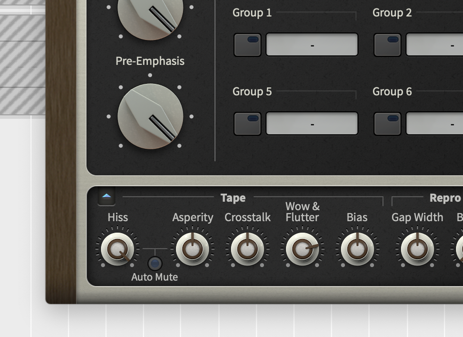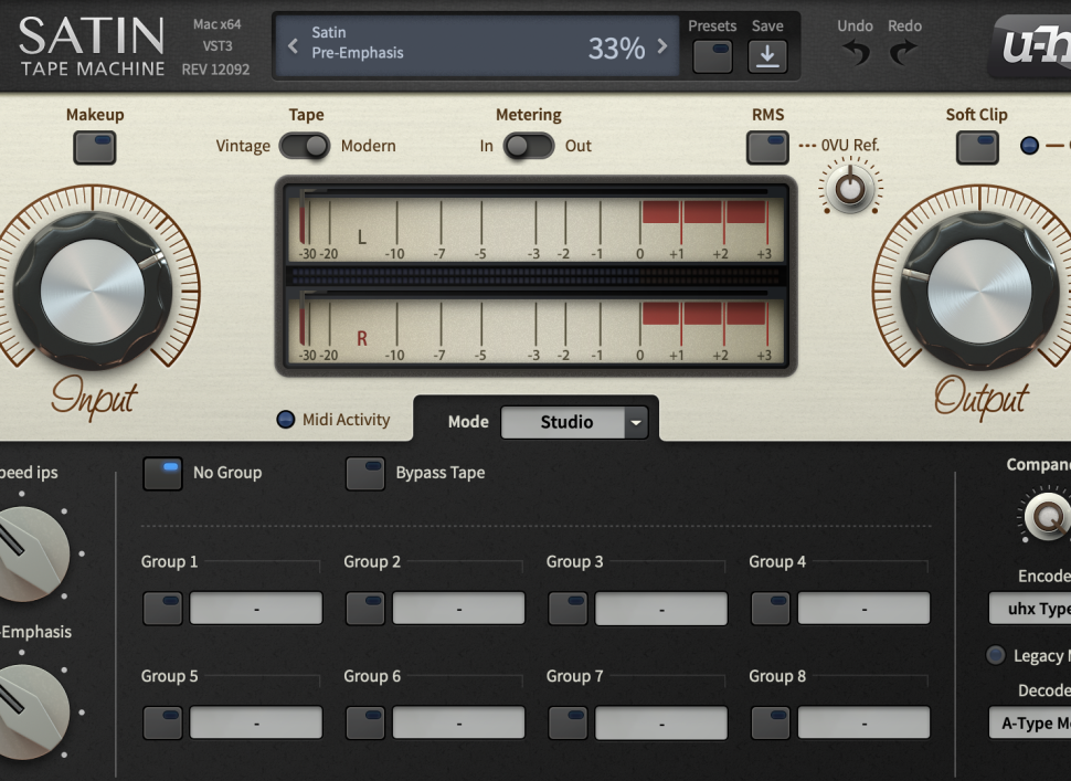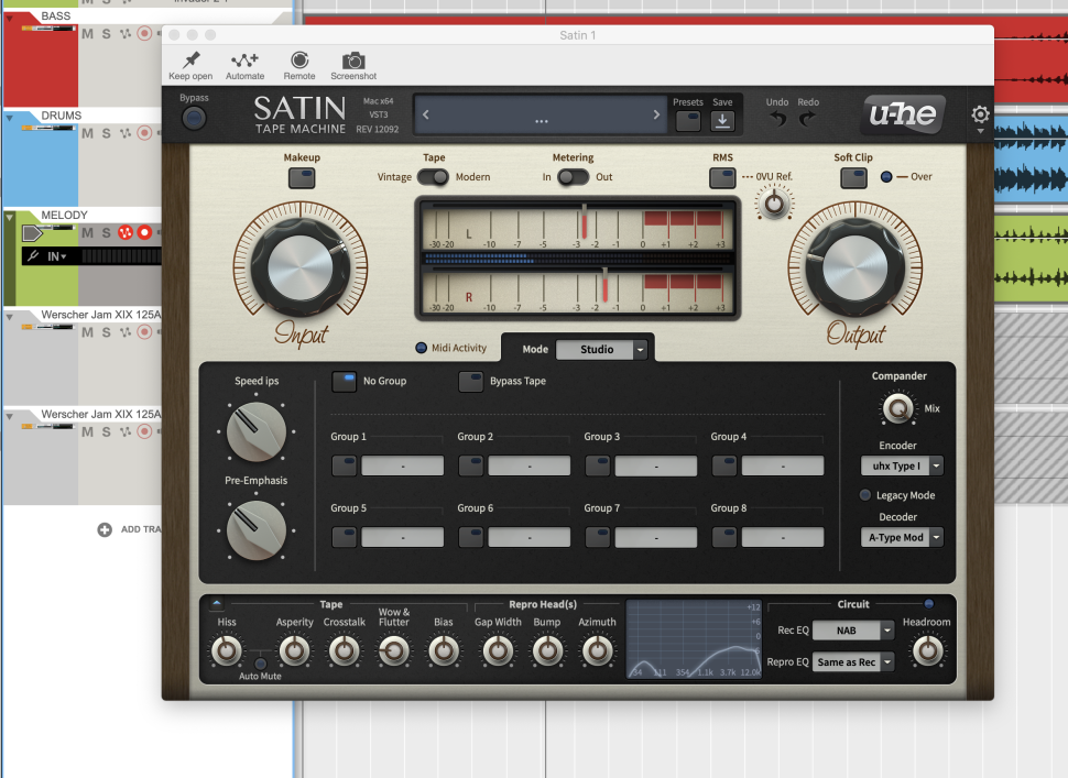 Im Studio-Modus bietet das Plug-in als Tape, wo wir zunächst Encoder und Decoder wählen, denn diese entscheiden hauptsächlich über den Klang. Model uhx Type I sorgt zusammen mit A-Type mod für einen Akzent auf den Höhen, was wir mit Speed ips und Pre-Emphasis auf jeweils 10 Uhr noch ausbauen, ohne wiederum zu grellen Sound zu erzeugen.