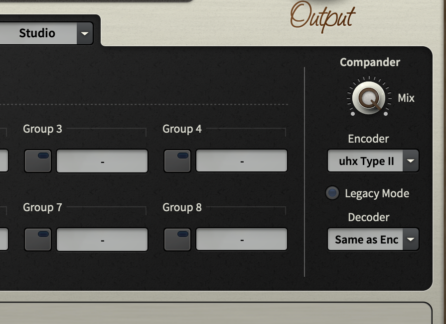 Es lohnt übrigens, mit den fünf En- und Decoder-Modellen zu experimentieren, denn sie alle emulieren verschiedene Techniken, die verwendet wurden, um einerseits Rauschen bei der Aufnahme zu unterdrücken und andererseits auf Tape aufgenommenes Material nachträglich wieder nachträglich um Höhen zu bereichern. Und jede davon bringt so ihre Eigenheiten mit.