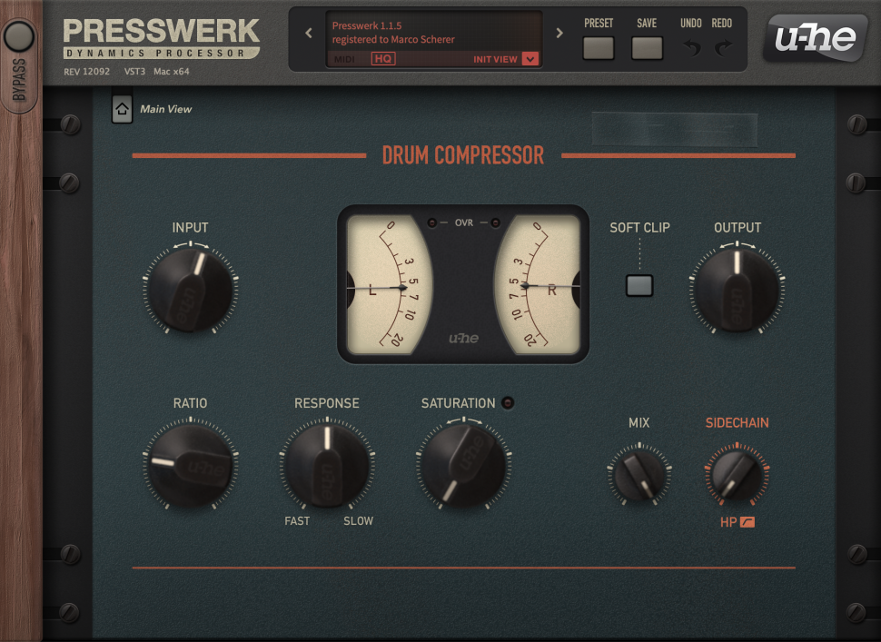 Nun wollen wir der Dynamik der Drums zu Leibe rücken, denn durch die Stem-Separierung wirken sie etwas holzig, abgehackt und steif. Dafür – abermals um bei einem homogenen Sound zu bleiben – nutzen wir u-he’s Presswerk, dessen INIT VIEW wir auf den Drum Compressor switchen. Ziel ist, die Gain Reduction zwischen 5 - 7 einzupendeln.