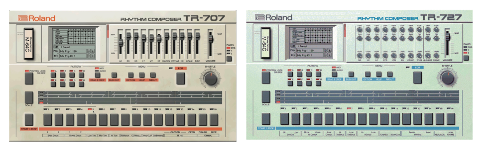 Die TR-707 und TR-727 sind zwei legendäre Drummaschinen der 80er Jahre, die von Roland nun virtuell als TR-707 und TR-727 Software Rhythm Composer nachgebildet wurden und die schon bestehende Legendary Collection in der Roland Cloud um neue Plugins erweitern. Die Besonderheit der Groove-Sequencer ist die samplebasierte Arbeitsweise. Ihre einstige niedrige Auflösung von 25 kHz und 8-Bit, teilweise auch nur 6-Bit, erzeugen einen vergleichsweise metallischen, rauhen Klangcharakter.
