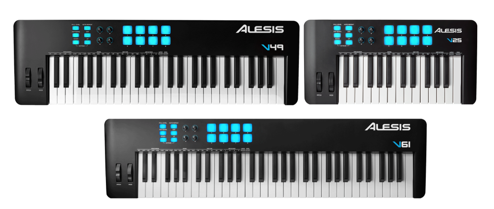 Alesis hat drei kompakte MIDI-Controller Keyboards hervorgebracht, die es je nach Bedarf in der Ausführung mit 25 Tasten (V25 MKII), 49 Tasten (V49 MKII), oder 61 Tasten (V61 MKII) gibt. Die mobilen, leichtgewichtigen USB-Keyboards verfügen jeweils über acht anschlagsdynamische, LED-hintergrundbeleuchtete Pads, sowie über vier individuell zuweisbare Potis für Parameter virtueller Instrumente oder einer DAW. Die obligatorischen Pitch- und Modulationsräder sind ebenfalls an Bord.