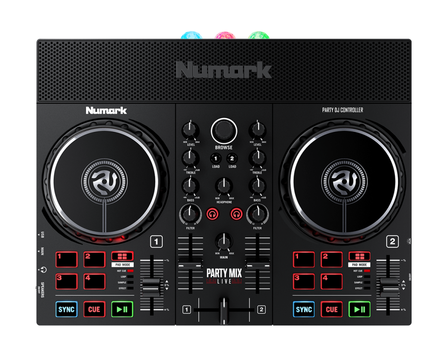 Klein und kompakt, aber mit eingebauten Stereo-Lautsprechern und integrierter Lichtanlage, will Numark mit dem DJ-Controller Party Mix Live angehende DJs an die Decks ziehen. Die drei LED-Lichter lassen sich zum Beat synchronisieren. Wenn mit Kopfhörern gemixt wird, können bei Bedarf auch die Lautsprecher deaktiviert werden. Der 2-Kanal-Controller bietet pro Deck vier Pads, die wahlweise für Hot Cues, Loops, Effekte oder auch zum Abfeuern von Samples genutzt werden können.