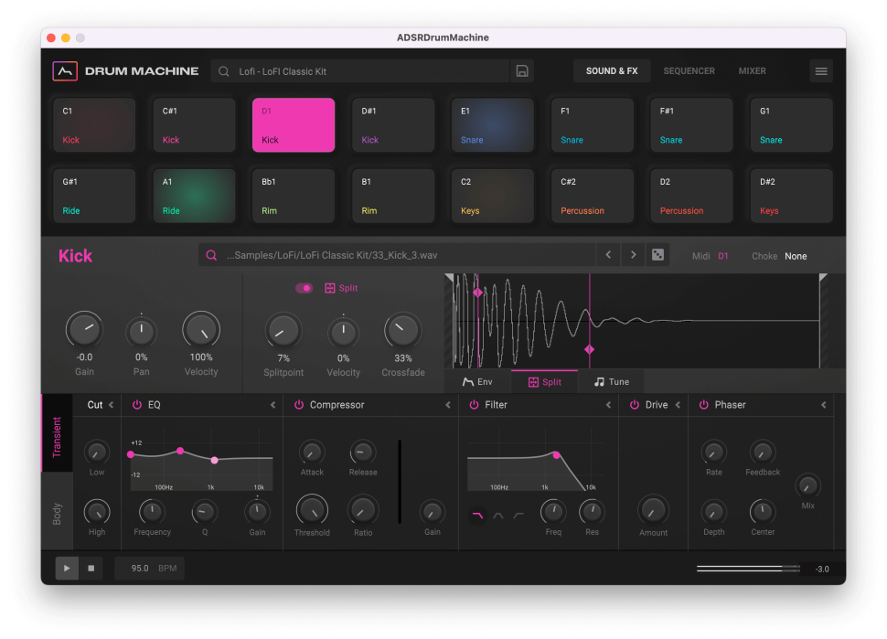 Die Samples können im Anschluss bezüglich ihrer Transienten separat vom Body des Samples in zwei Kanälen bearbeitet werden. Jeder dieser Kanäle hat Zugriff auf eine Effektkette mit 3-Band-Equalizer, Compressor, Filter, Drive und Phaser.