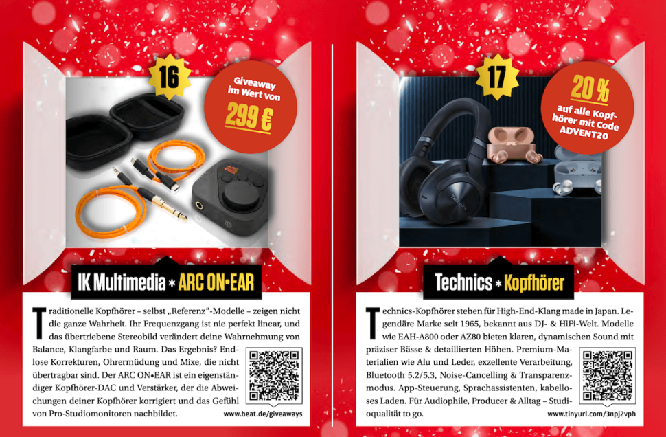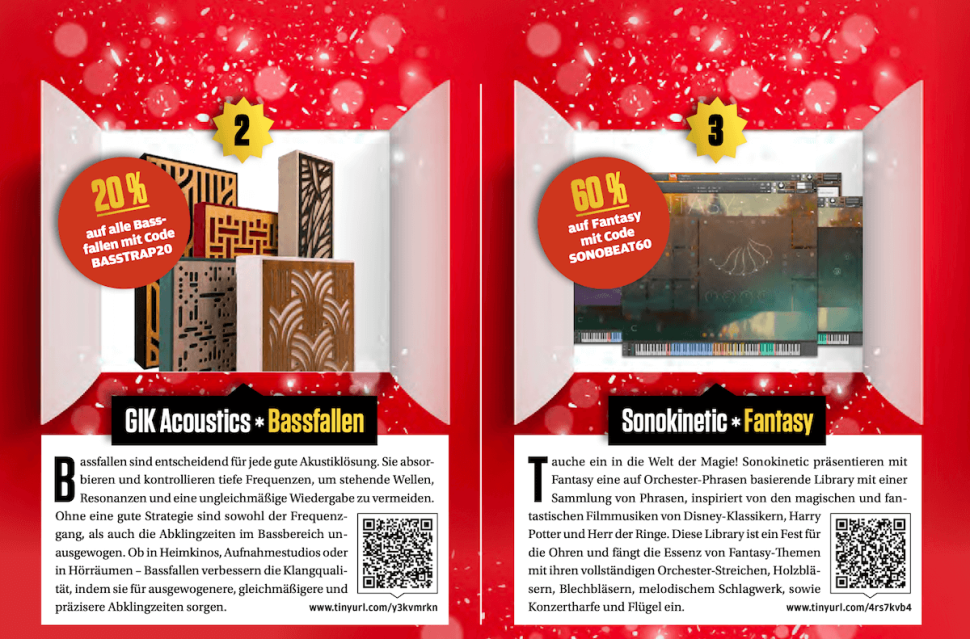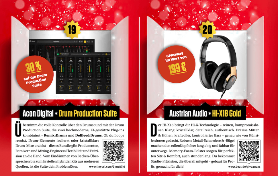 Es wird Zeit! Zeit für Weihnachten und einen anständigen Adventskalender für Musiker. Und genau den bekommst du dieses Jahr: Hinter 24 Türchen verstecken sich sensationelle Giveaways und Rabatte, nur exklusiv für dich als Beat-Leser. Und das Beste: du kannst sogar alle Türchen auf einmal öffnen! Synths, Recorder, Tutorials, Limiter, Soundbänke ... es ist von Allem und für alle was dabei.