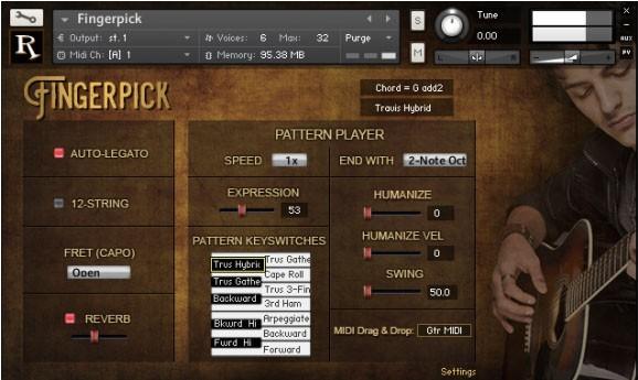 Das virtuelle Instrument liefert nicht nur eine Fingerpicking-Perfomance (Saiten werden mit einzelnen Fingern angeschlagen), sondern versorgt die Nutzer auch mit vielfältigen Pattern. Dazu wählt der Anwender über das virtuelle Keyboard einen Akkord in der passenden Tonhöhe und wechselt den Anschlag-Stil, bis das passende Pattern gefunden ist. Der integrierte Pattern-Player soll über vierzehn Akkord-Typen und 29 Fingerpick-Styles verfügen. Hinzu kommen noch der Auto-Legato- und 12-Saiten-Modus. Ferner kann der Nutzer virtuell den Kapodaster einstellen sowie mit Swing & Humanize-Optionen die natürlichen Irregularitäten der menschlichen Spielweise (Tempo & Anschlag) erzeugen.