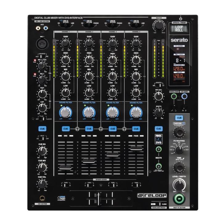 Der RMX-90 DVS ist ein 4-Kanal Clubmischpult mit integriertem 8 In/8 Out DVS Audio Interface im traditionellen DJ-Mixer-Layout. Ausgestattet mit einem 3-Band EQ (Classic/Isolator) und einer bipolaren Filtereinheit pro Kanal lassen sich Low Pass und High Pass Filter direkt einsetzen. Um dynamisch in den Mix einzugreifen, ist der RMX-90 DVS mit einer Beat-FX Einheit ausgestattet, die über 12 Effekte in Studioqualität verfügen soll. Diese sind individuell zuweisbar und lassen sich über den BPM Adjust zum Tempo der gespielten Musik synchronisieren. Auf der Oberseite des RMX-90 DVS finden sich zwei hochauflösende Digitaldisplays, die zur Visualisierung von Parameterveränderungen und der Zuweisung der Beat-FX Einheit dienen.