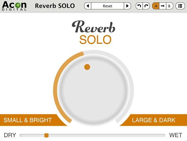 Reverb Solo bietet nur einen einzigen Regler, der sich in zwei Richtungen (also nicht endlos) bewegen kann. Steht der Punkt-Zeiger links unten, wird ein Hall von kleinen Räumlichkeiten generiert. Wird der Regler nach rechts aufgedreht, werden die nachgestellten Räume größer. Die Zwischen-Stufen sollen von kurzen und hellen bis hin zu langen und dunklen Hallfahnen und Klangfarben reichen. Ein Dry/Wet-Mix und ein AB-Vergleich unterstützen den Feinschliff.