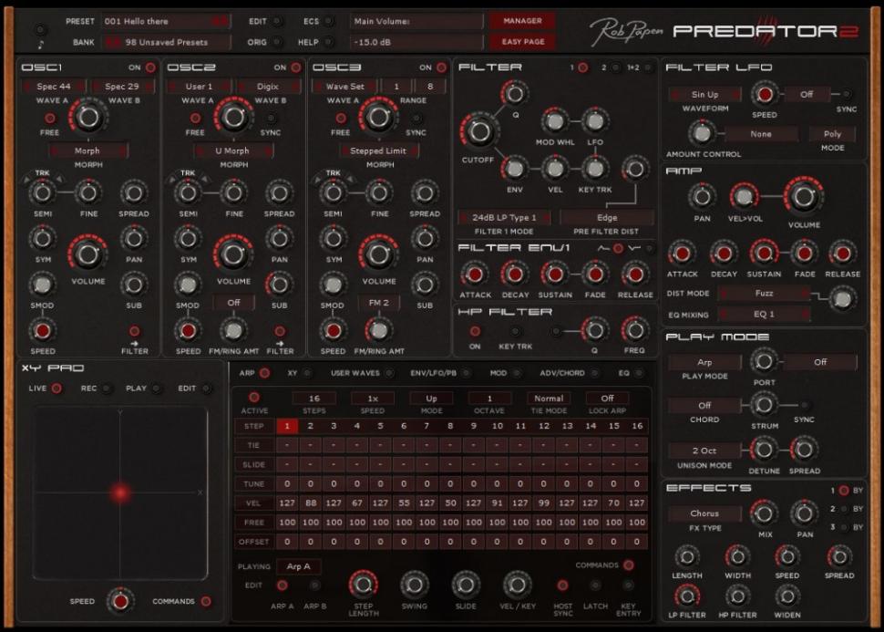 Predator 2 ist seinem Prinzip treu geblieben und auch weiterhin ein Synthesizer mit drei Oszillatoren, zahlreichen Modulations-Möglichkeiten und Effekten sowie einem Arpeggiator. Allerdings verfügen die Oszillatoren nun über duale Engines, sodass der Nutzer zwei Wellenformen pro Oszillator mischen kann. Zudem gibt es etliche Wavetables mit jeweils 256 Partialen inklusive User-Wavetables, wodurch die Oszillatoren noch mehr Klangfarben ausgeben können. Gab es bei der Vorgänger-Version lediglich ein Multimode- und ein Hochpass-Filter, so ist beim Predator 2 ein weiteres Multimode-Filter hinzugekommen. Darüber hinaus sind diese Filter in echter Stereo-Ausführung gegeben. Weitere Neuerungen sind zwei Arpeggiatoren, ein sechsfacher Unisono-Modus, ein XY-Feld zur Klangmanipulation und nicht zu letzt eine verbesserte Klangqualität mit analogem Flair.