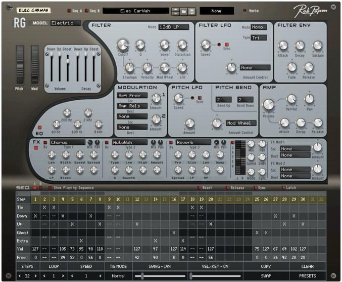 Dafür bietet RG-RE einen Sequenzer, Synthesizer-Features wie Filter, LFO, Hüllkurven und Modulations-Sektion sowie mehrere Effekte. Ein integriertes Keyboard lässt die Grooves sowohl in Dur- als auch in Moll-Akkorden spielen, so sind zwei Sequenz-Pattern und A/B-Varianten vorhanden. Die Klang-Grundlage bilden die klassische Fender Stratocaster E-Gitarre sowie Stahl-Saiten-Gitarren mit 8tel und 16tel Noten-Grooves. Ferner sind Power-Akkorde einer verzerrten Gitarre sowie gedämpfte und hochgeschaltete Einzelnoten dazugekommen.