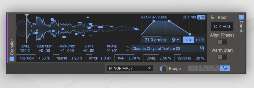 Mit Rate, Sync und Density gibt es drei Grain-Timing-Modi. Die Grains lassen sich daraufhin mit einer präzisen Frequenz von bis zu fünf kHz zu Tönen formen und mit dem Songtempo der DAW synchronisieren, sodass sich rhythmische Soundscapes erschaffen lassen. Des Weiteren ist es möglich mehrere Granulargeneratoren in ein Patch zu laden und sie für kreatives Sounddesign miteinander zu verbinden – für Klangstrudel und experimentelle Soundeffekte optimal. Weitere Funktionen dienen der Grain-Position, dem Timing, der Tonhöhe, dem Pegel und Panorama. Hinzu kommt ein Akkordmodus. Sofern erforderlich, können die Noten nacheinander oder zufällig wiedergegeben werden.