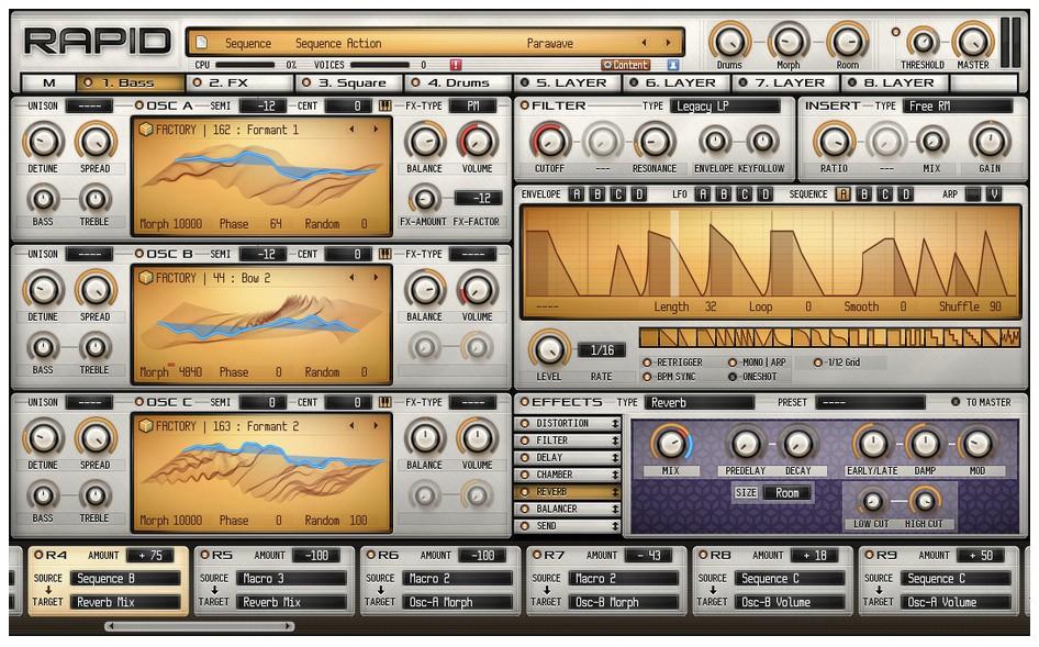 Der Rapid-Synthesizer setzt sich aus acht Layern zusammen. Jede Schicht enthält eine komplette Klangerzeugung mit drei Oszillatoren, Filter, mehreren Effekt-Blöcken, Modulatoren, Arpeggiator und einer Routing-Matrix. Ergänzend gibt es eine globale Sektion, in der Einzelsounds zusammengeführt und einer finalen Prozessierung per Multiband-Kompressor unterzogen werden können. Die Oszillatoren lassen sich mit verformbaren Wavetables oder Multi-Samples beladen. Insgesamt sind mehr als 420 Klangprogramme an Bord. Via Effekt-Stufen hat man die Möglichkeit, einzelne Schwingkreise mit Algorithmen für etwa Phasen-, Pulsweiten- oder Ringmodulation, Verzerrungen nach Röhren-Vorbild oder einem Rauschgenerator auszustatten. Die Resultate werden anschließend summiert und an ein Multimode-Filter geschickt. 20 Typen stehen zur Auswahl. Danach folgt erneut ein Effekt, der verschiedene Zerrer, einen Bitcrusher, Exciter und weitere Filter bereithält. Für Modulationen gibt es jeweils vier ADSR-Hüllkurven, LFOs und Sequenzer pro Layer. Der Arpeggiator bietet bis zu 32 Schritte. MIDI-Dateien lassen sich einladen und exportieren. Weitergehende Sound-Formungen sind mit Hilfe eines Multi-Effekt-Blocks machbar. Er verfügt über 18 Bearbeitungsstufen, sieben Stück lassen sich gemeinsam verwenden. Ergänzend bringt Rapid ein Trance-Gate, einen Equalizer sowie allerlei Zusatzfunktionen mit. Beispielsweise kann man Sounds gemeinsam in wichtigen Parametern editieren und auf Keyboard-Bereiche verteilen. Die Bedienung soll, trotz des großen Funktionsumfanges, leicht von der Hand gehen.
