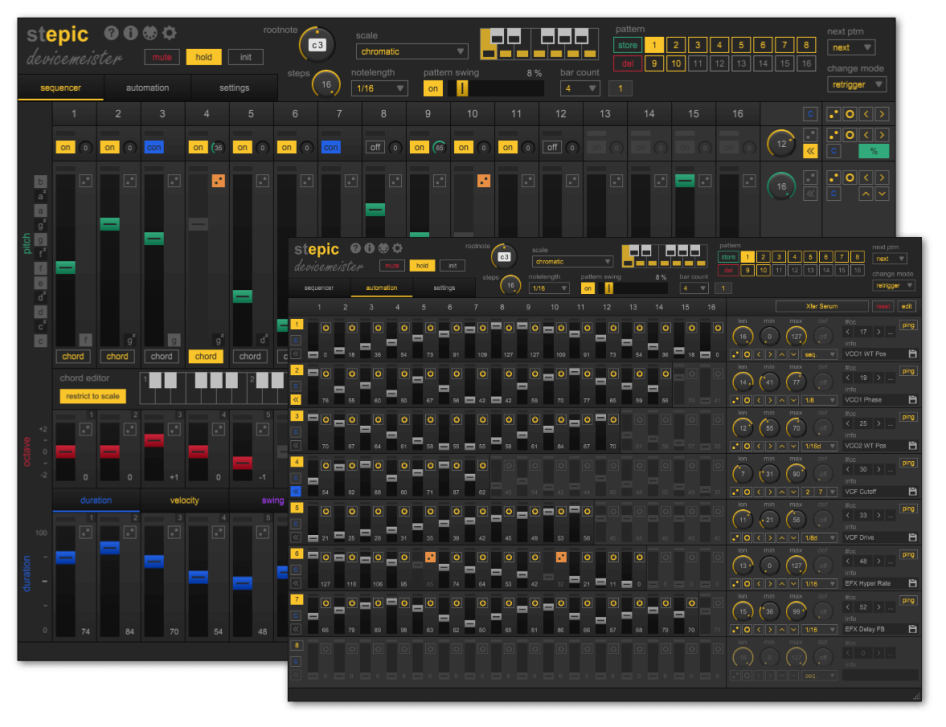 Einen umfangreichen polyphonen Step-Sequencer der die Komponenten Modulation und Sequencing vereint, hat Devicemeister mit StepicVST hervorgebracht. Zu dem Step-Sequencer gibt es acht Spuren die der Modulation dienen. So kann beispielsweise die Filter Cutoff, Wavetable Position, oder Effektintensität moduliert werden. Durch Zuweisung verschiedener Tempi und Sequenzlängen sollen sich tiefe, polyrhythmische Parameterverläufe für mehr Klangbewegungen erzeugen lassen.