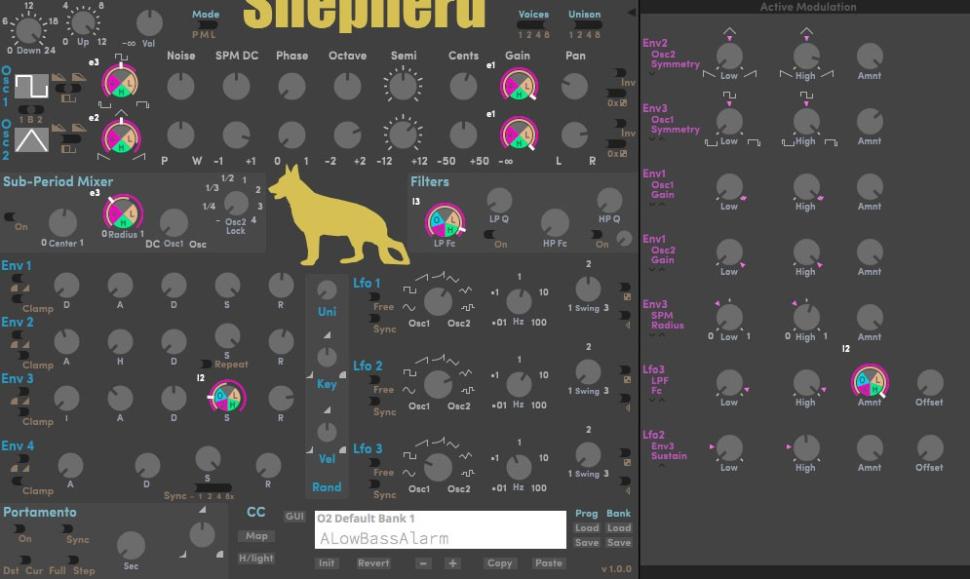 Shepherd bietet zwei Oszillatoren, die kontinuierliche Wellenformen (Dreieck/Sägezahn, Viereck/Puls etc.) produzieren und sich anhand mehrerer Parameter (bspw. Amplituden-Höhe, Wiederholungsmenge, Austausch-Ort) subperiodisch verbinden lassen. Noise- und Phasen-Generatoren, Tonhöhen-Kontrolle, Panorama- und Gain-Steuerung sind inklusive. Zur Sound-Formung und Modulation werden die Hoch- und Tiefpassfilter mit drei LFOs und vier Hüllkurven (DADSR, AHDSR, IADSR und ADSR) gefolgt. Zusätzlich bietet jeder Oszillator eigene Modulation inklusive Keyboard-Erkennung, Noten-Anschlag, zufälliger Elemente etc.