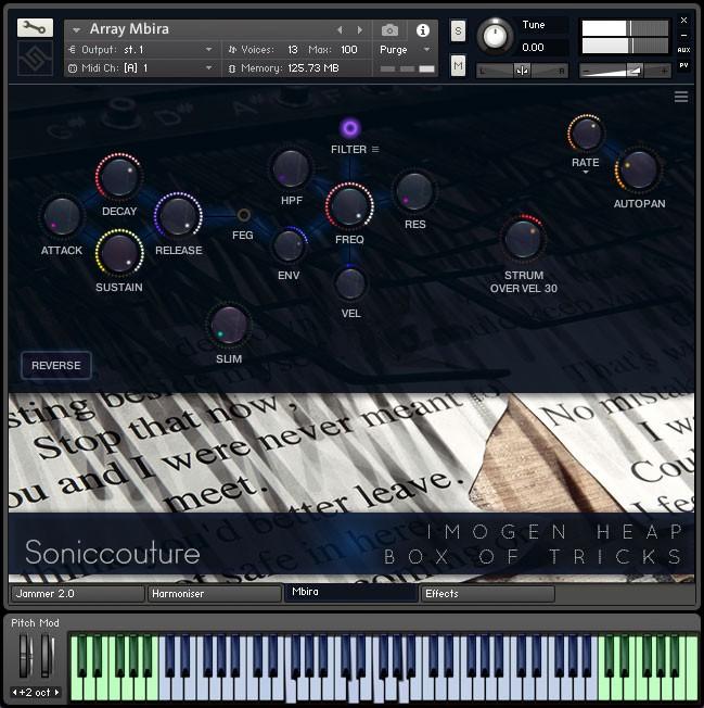 Imogen Head: Box of Tricks bringt 30 GB Klang-Material mit dreizehn exotischen Instrumenten ins NI-Kontakt-Format. Den Anfang macht das virtualisierte Array Mbira (ein handgefertigtes Instrument mit Glocken/Harfen-ähnlichem Sound), das mit einem Keyboard inklusive Split-Funktion und Anschlagssteuerung versehen wurde. Box Tricks Nummer 2 sind Boomwhackers (gestimmte Kunststoffröhren für perkussive Klänge), gefolgt vom Cello, das von der Künstlerin eigenhändig mit einer zarten Bogenführung eingespielt wurde. Weiterhin finden sich Instrumente wie Vibrafon, Steel Tongue Drum, Glockenspiel, Jazz Kits, Synth-Lines und Vocal Pads, die den Nutzer mit außergewöhnlichen Klängen beliefern. Zudem stellt die Instrumenten-Sammlung Performance-Module als Spielhilfe sowie Tools zur Sound-Veredelung bereit, wie beispielsweise Harmonizer, Jammer (Arpeggiator), Strum, Filter inklusive 14 Typen und 17 Effekte inklusive Faltungshall.