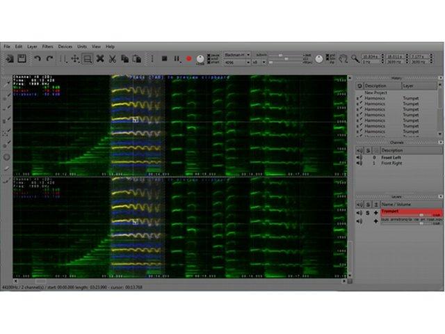 Spectral Layers analysiert das Audiomaterial und erzeugt eine grafische Oberfläche für die anschließende Bearbeitung. Die horizontale Achse repräsentiert die Zeit und die vertikale Achse das Audiospektrum.
