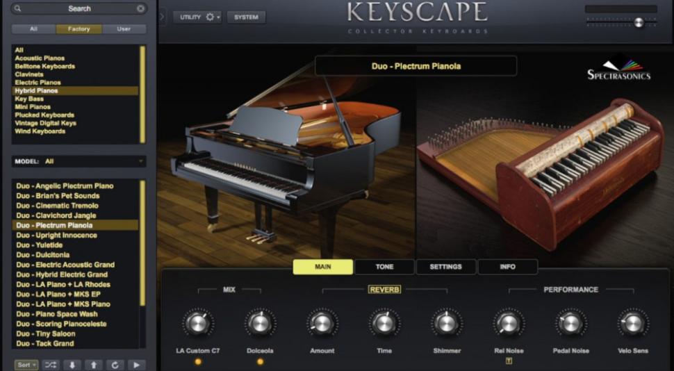 Keyscape beinhaltet 36 Pianos, Flügel, E-Pianos und mehr, verteilt auf 77 Gigabyte mit über 500 Sounds. Besonders spannend ist der Fakt, das Keyscape-Sounds in die Bibliothek von Omnisphere 2 integriert und mit dessen Effekten veredelt werden können. Natürlich finden sich in Keyscape auch unzählige Parameter zur Feinabstimmung des jeweiligen Instruments. Ein besonderes Feature ist der Hybrid-Modus, bei dem zwei Instrumente zu einem neuen Klangerzeuger gegossen werden.