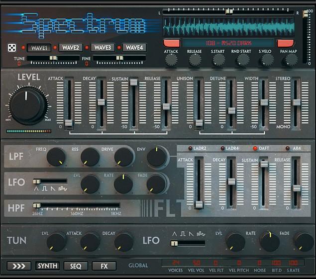Den Kern von Spektrum bildet eine vielfältige Kollektion von 175 Synthesizer-Patches und über 10000 Samples, die von und nach großen Vorbildern kreiert wurden. Ob verschiede Moogs, Roland-Boliden, Arp Odyssey, Korg oder Yamaha, bis zu vierzehn ikonische Namen sind anzutreffen. Die Benutzeroberfläche bietet vier Oszillatoren, deren mehrfach gesamplete Welleformen sich beliebig schichten lassen. Hinzu kommen noch virtuell-analoge Filter, ein Modulations-Bereich, Effekte sowie ein integrierter Step-Sequenzer.