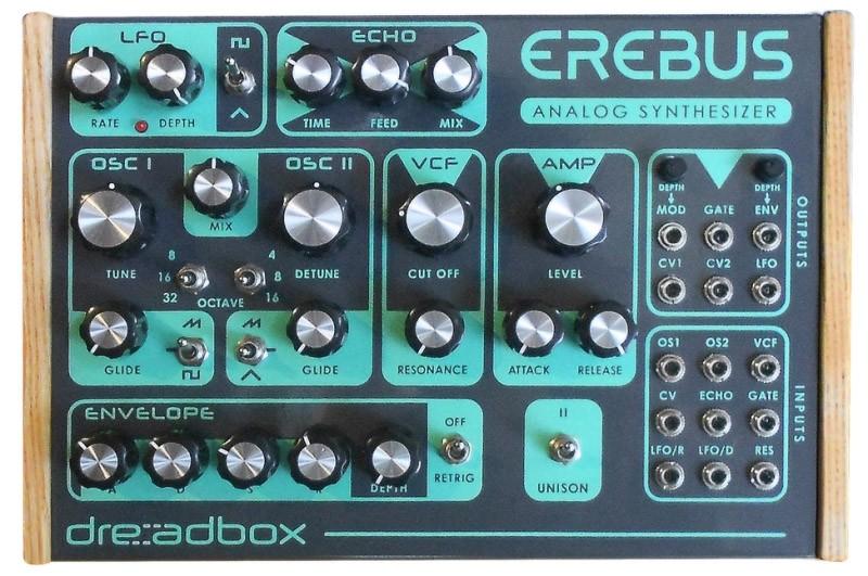 Die Ausstattung des Dreadbox Erebus wirkt für einen Analogboliden des unteren Preissegments üppig. Zur Klangerzeugung setzt Erebus zwei Oszillatoren ein, nachfolgend stehen ein Tiefpassfilter und ein Verstärker im Signalweg. Darüber hinaus hat der Neue einen Echo-Effekt an Bord, der seine Arbeit auf Grundlage einer klassischen Eimerketten-Schaltung verrichtet. Modulatoren sind in Form von zwei Hüllkurven und einem LFO vorhanden, für die kreative Verknüpfung aller Komponenten gibt es eine Patch-Matrix.