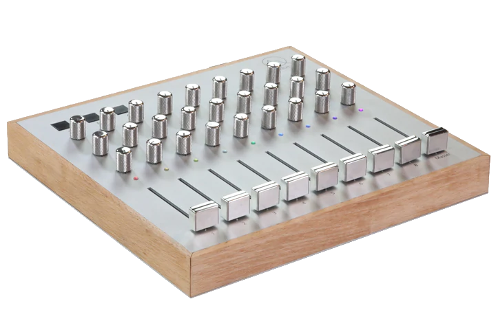 Einen ansehnlichen MIDI-Controller, der anstelle üblicher Modelle nicht aus Plastik sondern aus Edelstahl gefertigt ist, hat Midique mit dem KNTRL9 hervorgebracht. Auch das Gehäuse, das aus Massivholz (wahlweise Eiche oder Walnuss) geschnitzt ist, ist ein optischer Blickfang. Dadurch soll sich jede beliebige DAW bequem steuern lassen. Für die voll kompatible Ableton Live ist sogar ein MIDI-Script vorhanden.