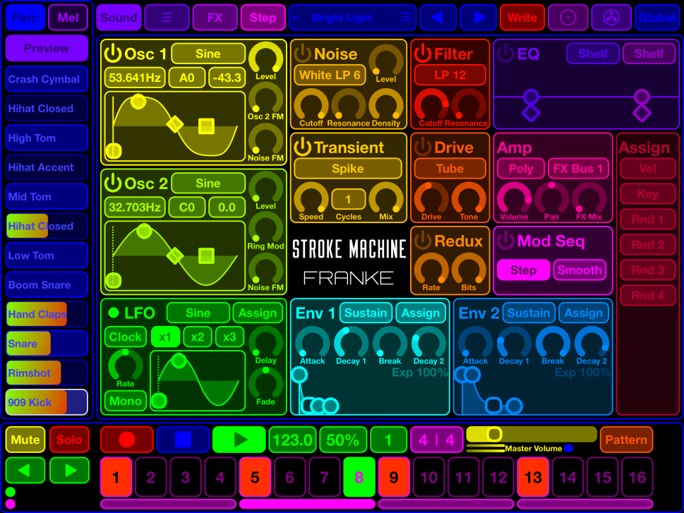 Der ehemalige Waldorf-Entwickler Wolfram Franke bringt mit Stroke Machine einen professionellen Drum- und Groove-Synthesizer und -Sequencer für das iPad an den Start. Stroke Machines leistungsfähige Tonerzeugung bietet hochwertige Oszillator-, Filter-, Overdrive- und Effektmodelle, extrem schnelle Hüllkurven und LFO, einen Sample-genauen Pattern-Sequenzer und eine umfangreiche Sample-, Sound- und Pattern-Bibliothek.
