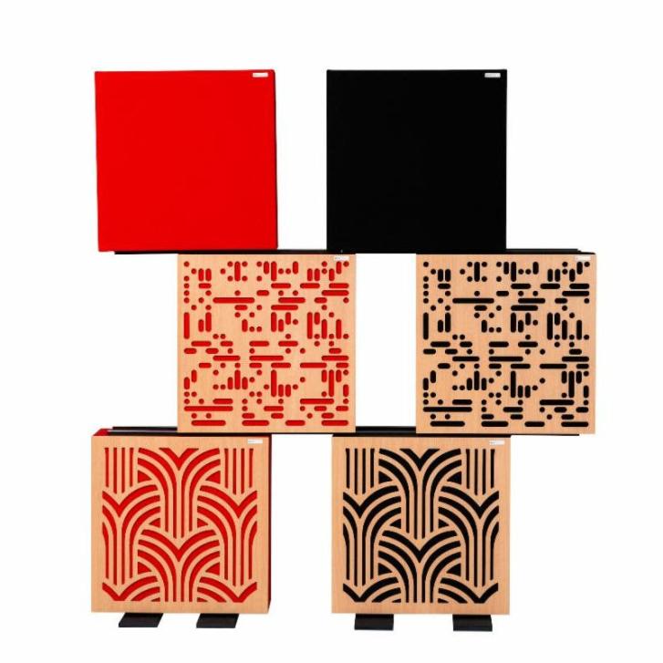 Bei Bedarf lassen sie sich auch an Wände montieren. Dank der Bautiefe sollen die Modulesogar bis 50 Hz wirksam sein. Es gibt mehrere Optionen, um die Mitten und Höhenabsorption zu verändern: Full Range umfasst die vollständige Absorption, Range Limiter Bassfalle dient der unteren Mitten und Bassabsorption, die Alpha-Diffusionsplatten und Impression-Platten sind für Streuungseffekte. Bis auf das unterste Modul, das zum Aufbau einer Akustikwand mit Füßen ausgestattet ist, werden die Module mit Schienen verbunden. Verschiedene Muster werden zur Optimierung der Ästhetik der Front- und Rückseite geboten.