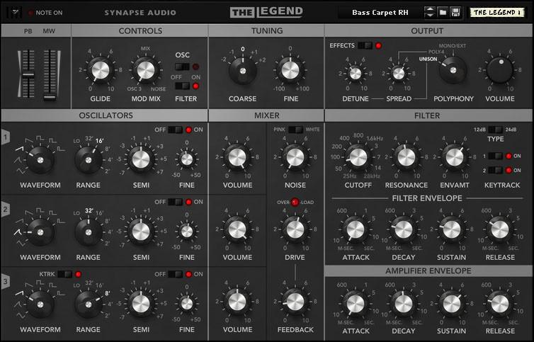 In Zusammenarbeit mit den Synthesizer-Spezialisten der Bigstone Studios entwickelt, soll The Legend das analoge Hardware-Verhalten jeder Komponente übergenau reproduzieren. Geboten werden drei VCOs mit etlichen Wellenformen, Halbton-Steuerung und Mixersektion, gefolgt von zweier Filtern und einem Verstärker. Dedizierte Hüllkurven für VCF und VCA und integrierte Delay- und Reverb Effekte runden die Ausstattung ab.