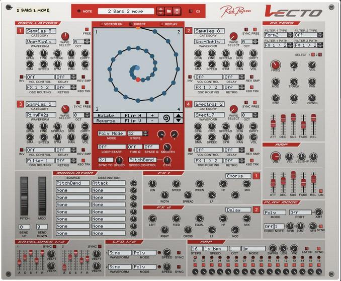 Zwar sind die Details noch geheim, aber das Demo-Video und die wenigen Hersteller-Ankündigungen geben einiges über den Vecto preis. Dieser lässt sich polyphon spielen und erzeugt seinen Klang mittels vier Oszillatoren, die mit etlichen Wellenformen bestückt sind (analog modelliert, additiv, spektral, gesampelt). Der Sound lässt sich in einem Vektor-Pad (Joystick beim Vorbild) mischen und über einen flexiblen Vektor-Pfad automatisieren (via LFO und Hüllkurve) beziehungsweise bearbeiten (ziehen, verschieben etc.). Wie bei Rob Papen üblich, gibt es ist eine üppige duale Filtersektion mit 28 Filtertypen und einer ADSFR-Hüllkurve. Ferner werden zahlreiche Effekte, Modulations-Möglichkeiten, ein Arpeggiator und mehr als 600 Presets geboten.