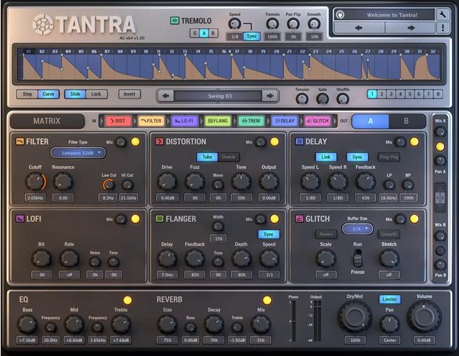 Alle Effekte in Tantra sind in zwei unabhängigen Ebenen organisiert. Den Kern bildet eine Modulator-Sektion inklusive Mod-Matrix, die ein Modulations-Signal erzeugt und rhythmische Pattern bestimmt. Hierzu generieren acht Modulatoren editierbare Hüllkurven mit 32-Phasen, die durch Parameter wie Sync, Speed, Smooth, Tremolo und Pan Flip justiert werden können. In der Effekt-Sektion stehen sechs Soundprozessoren bereit: analoges Filter, Distortion, Lo-fi, Delay, Flanger und Glitch (Stotter-Effekt). In letzter Instanz wird das Ausgangs-Signal durch einen Master-EQ und Reverb veredelt.