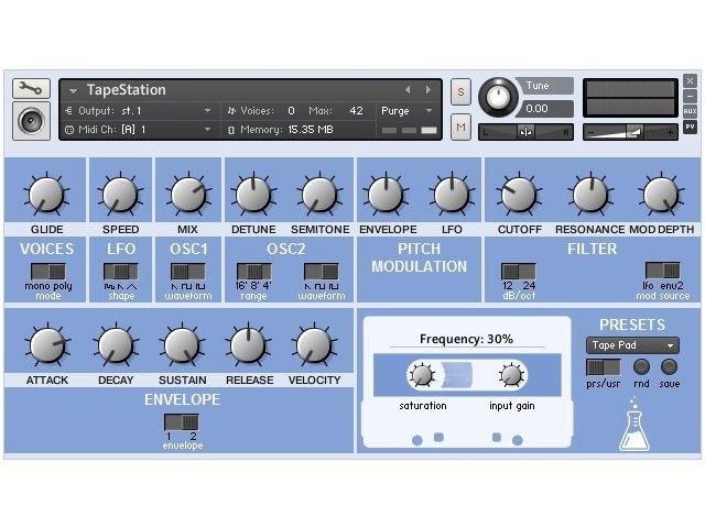 TapeStation bietet dem Nutzer Zugriff auf zwei Oszillatoren mit den oben genannten Wellenformen einen Filter mit 12/24dB-Flankensteilheit. Zu seinen Modulationsquellen zählt das Kontakt-Instrument einen LFO, zwei Hüllkurven und einen Modulation-Pitch. Insgesamt 24 Factory-Presets und 24 User-Presets stehen ab Werk zur Verfügung.