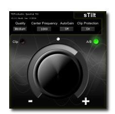 S-Tilt arbeitet mit einer Tilt-Funktion, welche durch das Kippen den Frequenzgang beeinflussen kann. Wird der Filter um einen bestimmten Frequenzpunkt Richtung Tiefen gedreht, werden diese abgesenkt und die Höhen betont und umgekehrt. Hinzu kommt noch die phasenlineare Arbeitsweise des S-Tilt, diese soll die Phasenverschiebungen über alle Frequenzen konstant halten. Die Flankensteilheit lässt sich von -6 bis +6 dB/Oktave justieren, die Zentralfrequenz kann beliebig eingestellt werden. Bei Bedarf lässt sich auch ein automatischer Gain hinzuschalten, ein Limiter zum Schutz gegen Clipping ist ebenfalls an Bord. Eine Möglichkeit zum A/B-Vergleich sowie eine Audiobearbeitung in fünf Qualitätsstufen schließen den Funktionsumfang ab.