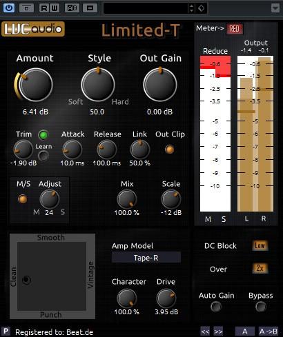 Der LVC Audio Limited-T ist ein Charakter-Limiter, der sowohl auf Einzelspuren als auch in Bussen eingesetzt werden kann. Die Basis bildet eine Kompressor-/Limiter-Einheit mit transparentem Klang. Mithilfe fünf verschiedener Amp-Modelle lassen sich dem Signal die Eigenschaften verschiedener Hardware-Dynamikprozessoren aufprägen. Mit dem Trim-Regler sollte zuerst die Eingangslautstärke angepasst werden eine LED zeigt, ob der Pegel korrekt ist. Auch die automatische Pegelanpassung funktionierte im Test meist gut. Der Style-Control-Regler ändert die Steilheit und Form der Kompressions-Kurve und das programmabhängige Release-Timing. Letzteres bedeutet, dass lang anhaltend laute Signale zu einer längeren Release-Zeit führen, kurzzeitige Pegelspitzen zu einer kürzeren. Deaktiviert man diesen Modus, arbeitet Limited-T wie ein analoger Limiter.