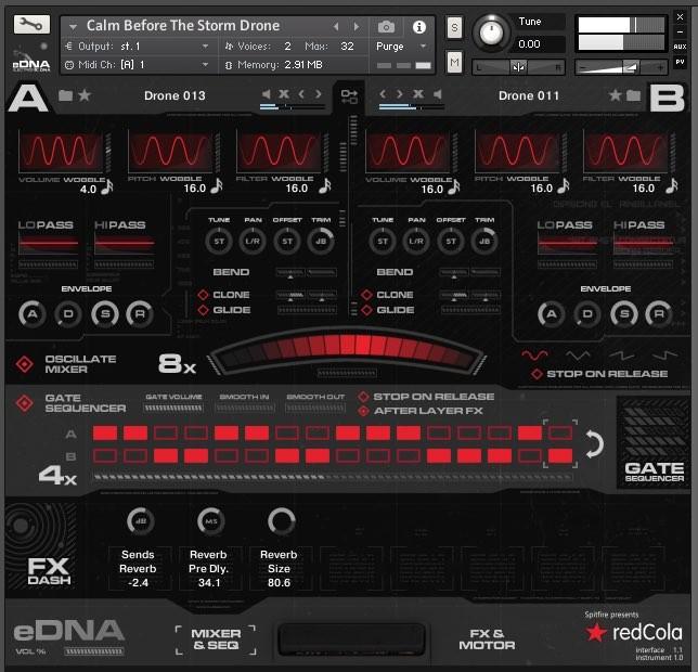 Trailer Giant macht von der mächtigen eDNA-Engine von Spitfire Gebrauch. Ihr Funktionsumfang wird zunächst erschlagend. Ist man allerdings erst einmal mit den weitreichenden kreativen Möglichkeiten vertraut, möchte man diese nicht mehr missen. Die Klangerzeugung stützt sich auf zwei Sample-Oszillatoren mit eigener Lautstärkehüllkurve, eigenem resonanzfähigen Tief- und Hochpassfilter und Effekt-Rack. Die Sample-Oszillatoren bieten individuelle Tune-, Pan-, Pitch-Bend- und Glide-Parameter. Mithilfe der Clone-Funktion ist zudem die Dopplung der geladenen Samples möglich, z. B. für voluminöse Unisono-Klänge möglich. Mit den so genannten Wobble-LFOs lassen sich hingegen auf einfache Weise temposynchrone Modulationen der Lautstärke, Tonhöhe und Filterfrequenz erzielen. Schade, dass hier keine anderen Wellenformen außer Sinus zur Auswahl stehen. Der Oszillator-Mixer erlaubt schließlich ein Überblenden zwischen den beiden Signalquellen. Praktischerweise lässt sich dieser Parameter für lebendige Soundvariationen auch mit einem LFO, dem Modulationsrad oder einem beliebigen MIDI-Controller steuern. Für weitere Bewegung im Klanggeschehen sorgt der Gate-Sequenzer, mit dem Sie die Oszillatorsignale unabhängig voneinander rhythmisch zerhacken können. Auf der FX-Seite finden Sie schließlich ein Rack mit einer umfangreiche Effektausstattung. Für den direkten Zugriff lassen sich acht bevorzugte Effektparameter auf dem so genannten Dashboard auf der Hauptseite platzieren. Eine weitere Besonderheit sind die MotorFX, zwei Effekte, deren Parameter mittels LFO gesteuert werden können.