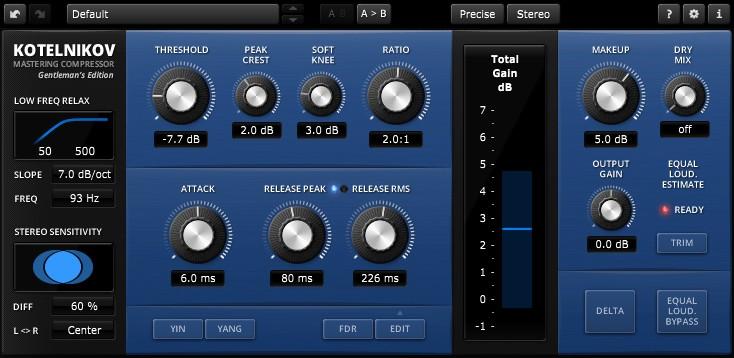 Kotelnikov überzeugt mit sehr schnellem Ansprechverhalten, und selbst bei starker Komprimierung klingt das Ergebnis überwiegend natürlich. Charakter, Druck und Transienten bleiben erhalten, so dass sich Kotelnikov insbesondere für den Mastering-Bus empfiehlt. Aber auch das Zusammenschweißen verschiedener Schlagzeugspuren zu einem einheitlich klingenden Drumset gelingt mit Bravour. Bereits die kostenlose Version weiß mit transparentem Sound und interessanten Features zu überzeugen. So können die Release-Zeiten der parallel arbeitenden Peak- und RMS-Kompression getrennt geregelt werden. RMS orientiert sich am Mittelwert des Eingangssignals und klingt daher in der Regel natürlicher, ist aber oftmals mit der Verarbeitung von Transienten überfordert. Dies kann der Peak-Modus ausgleichen, insoweit verbindet Kotelnikov das Beste beider Welten. Die Gentleman Edition wartet noch mit weiteren Finessen auf, wobei insbesondere die frequenzabhängige Kompression und die erweiterte Loudness-Kontrolle hervorzuheben sind.