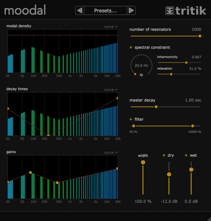 Den Kern des Plug-ins bildet die Resonanz-Engine, die mit tausend rückschallenden Filtern Objekte nachbilden soll, sei es Ketten, Flaschen, Platten oder nachhallende Räume wie Aula und Flur. Zur einfachen aber tiefgreifenden Kontrolle der Resonator-Eigenschaften bietet die Benutzeroberfläche drei editierbare Kurven (Modal Density, Decay Times und Gain), um die Klangfarbe, Filterzahl und Amplitude zu beeinflussen. Der Nutzer kann die Presets nach unterschiedlichen Räumen durchforsten und eigene Einstellungen mit dem sogenannten Freezer festhalten.