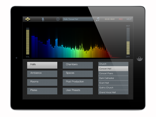 Nach der Erfindung von Audiobus und dem damit möglich Audio-Routing zwischen verschiedenen Apps war es nur eine Frage der Zeit, bis das iPad als Effektgerät herhalten muss. So hat VirSyn nun das hauseigene Reverb für iOS adaptiert. Die App ist eine Kobination aus algorithmischem Hall, der in Echtzeit berechnet wird sowie der Impulse-Response Variante, die auf bereits aufgenommene Hallfahnen zurückgreift.