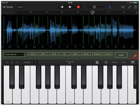 Ob aufgenommen oder geladen, der Audio-Slicer zerkleinert die Loops in 32 Elemente, die einzeln und flexibel positioniert und bearbeitet werden. Neben Panorama, Lautstärke, Tonhöhe und Hüllurve kann jedes Segment mit sieben Effekten (Filter, Phaser, Flanger, Chorus, Hall, Distortion, Delay) angepackt werden. Rearrangiert und rhythmisiert wird mit einem polyrhythmischen Arpeggiator, der 32 Schritte, vier Abschnitte und Randomisierung erlaubt. Gespielt wird entweder über die Touch-Oberfläche oder ein angeschlossenes MIDI-Keyboard.
