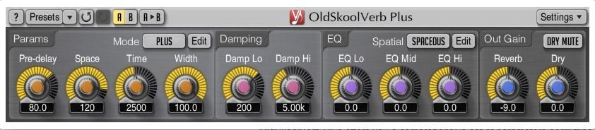 OldSkoolVerb Plus bietet eine aufgeräumte Oberfläche mit genügend Parametern, um die Signale unterschiedlich zu verhallen. Die Einstellungen für Pre-Delay, Verzögerungs-Zeit, Hall-Breite und Raum-Größe sind gegeben, ebenso Dämpfungs-Parameter, Equalizer und Dry/Wet-Verhältnis. Zudem kann der Nutzer im Reverb-Editor und im sogenannten ''spatialization module'' (Verräumlichung-Modul) die Raumbilder und Halldichte justieren, erzielt werden unterschiedliche Hall-Arten wie Platten-, Raum- und Aula-Hall. Stereo-Bearbeitung, AB/Vergleich, Preset-Manager, Undo/Redo-Historie sowie die Unterstützung mehrere Sampling-Raten schließen den Funktionsumfang ab.