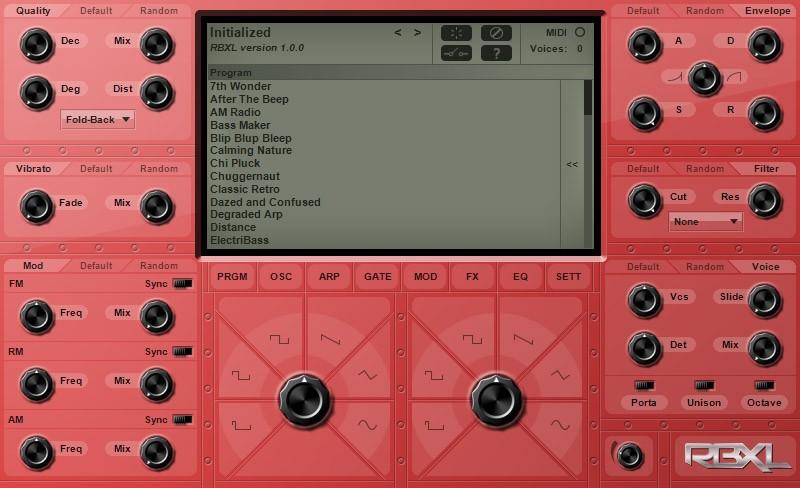 RBXL gilt als ein hybrider Synthesizer, der mit zwei Oszillatoren je sieben Wellenformen sowohl die subtraktive Synthese als auch Frequenz-, Ring- und Amplituden-Modulation unterstützt. Das Filtermodul mit Hoch-, Tief und Bandpass-Charakteristika bietet zusätzlich einen Reject-Modus, alle Filterarten können mit unterschiedlicher Flankensteilheit eingesetzt werden. Weiter im Signalweg stehen ein LFO und eine Hüllkurve, die flexibel über 20 Parameter modulieren können. Die integrierte Effekt-Einheit bietet einen parametrischen EQ sowie FFT-Analyse und Reverb, Delay, Chorus, Stereo und Phaser. Zu guter Letzt kann der polyphone Synthesizer (64 Stimmen) in Unisono-Modus, mit Portamento und Slide gespielt werden, der Arpeggiator wartet mit 16 Schritten und den justierbaren Parametern Tuning (Oktave, Semi, Fine), Gate und Geschwindigkeit auf.