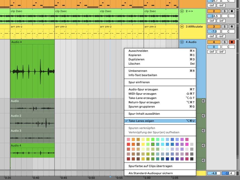 Schon erscheint der Part in der ursprünglichen Aufnahme-Spur, in der der finale Take angelegt wird. Hören Sie alle Take-Lanes an, selektieren Sie die besten Stellen daraus, drücken Sie Enter und schon haben Sie einen perfekten Take. Um die Take-Lanes wieder auszublenden, gehen Sie ins Kontextmenü und deaktivieren Sie die Funktion mit einem Klick.