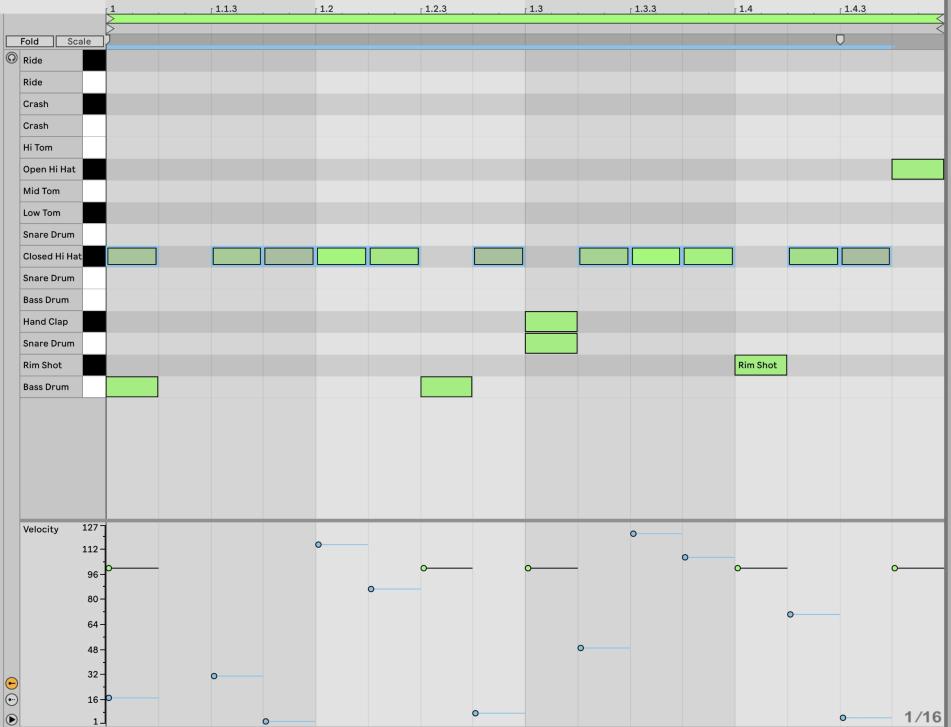 Laden Sie ein Drum Rack und programmieren Sie einen einfachen Beat. Unterhalb der MIDI-Noten-Editors finden Sie den Velocity-Editor. In Live 11 wird der Velocity-Wert nicht mehr durch einen Balken, sondern durch einen Punkt, verbunden mit einer horizontalen Linie dargestellt. Durch das Ziehen an Punkt oder Linie können Sie manuell die Velocity ändern.
