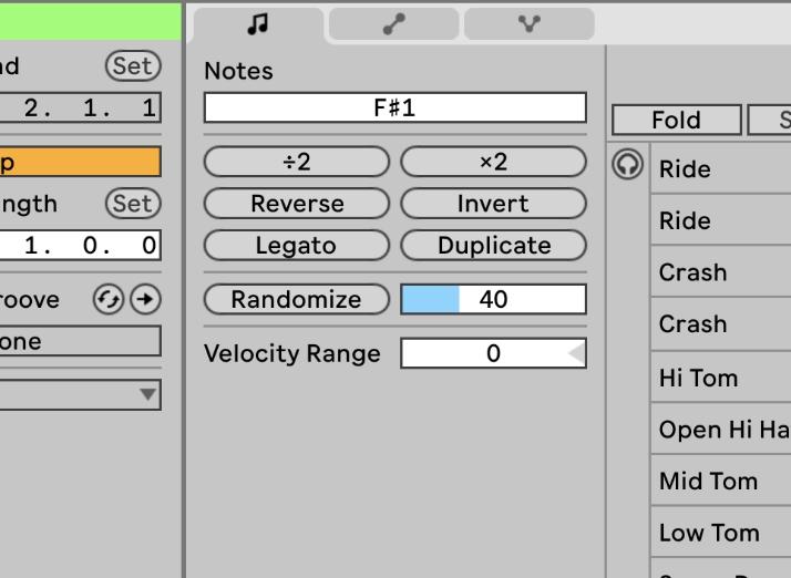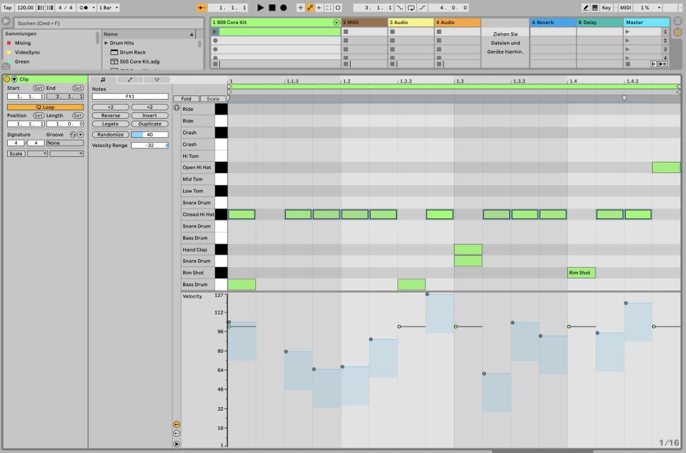 Einfacher geht dies automatisch, indem Sie die Noten, bei denen die Anschlagsstärke geändert werden soll, selektieren und dann im Notes-Editor auf Randomize klicken. Wählen Sie alle Hihats aus und klicken Sie (wiederholt) auf Randomize, bis Ihnen das Ergebnis gefällt. Ist keine Note selektiert, wird die Velocity für alle Noten im Clip verändert.