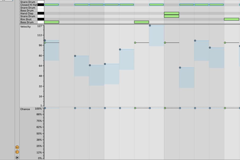 Selektieren Sie wieder einzelne, bzw. alle Hihats in Ihrem Drum Beat. Wenn Sie jetzt auf Randomize klicken, werden die Wahrscheinlichkeitsmarker der Hihats bei jedem Durchgang geändert, je höher der Wert, desto wahrscheinlicher, dass die Note erklingt. Auch hier können Sie wieder den Wertebereich der gesetzten Marker mittels Randomize vorgeben.