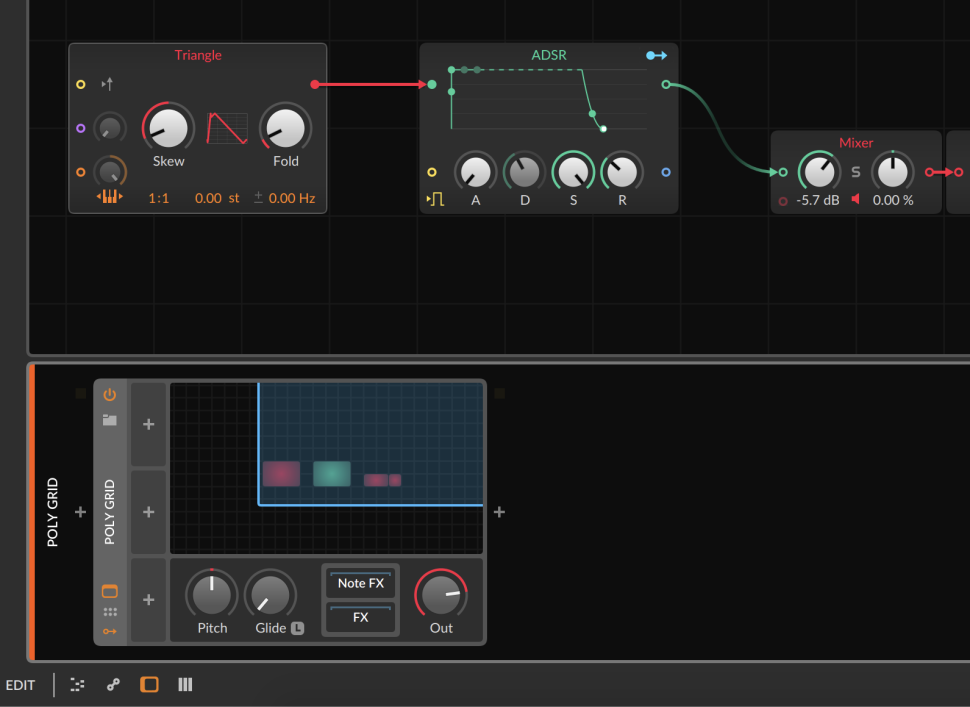 Als Basis für das Projekt verwenden wir - natürlich - eine Instanz von Poly Grid und hängen dort direkt ein ADSR-Modul zwischen Triangle und Mixer. Drehen Sie Sustain voll auf, womit der Output nur dann zu hören ist, wenn Sie eine Note spielen. Ansonsten läuft der Sound permanent durch. Als Grundlage für Sequenzen und Melodien soll ein Dice-Modul dienen.