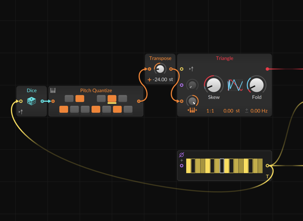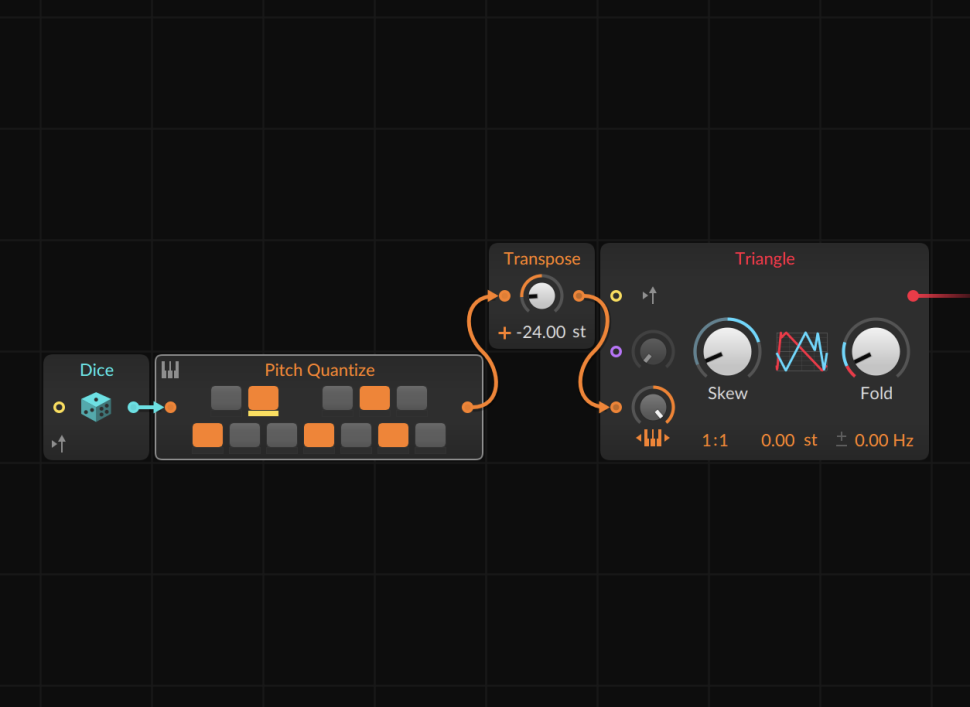 Damit die Resultate nicht komplett beliebig ausfallen, schalten wir ein Pitch Quantize dahinter und ein Transpose-Modul, das in den PITCH IN von Triangle mündet. Den Modulationsregler drehen wir voll auf. Per Transpose pitchen wir die Noten 24 Halbtöne herunter. Das geht zwar auch direkt im Triangle-Modul, doch wir brauchen das extra Modul später noch.