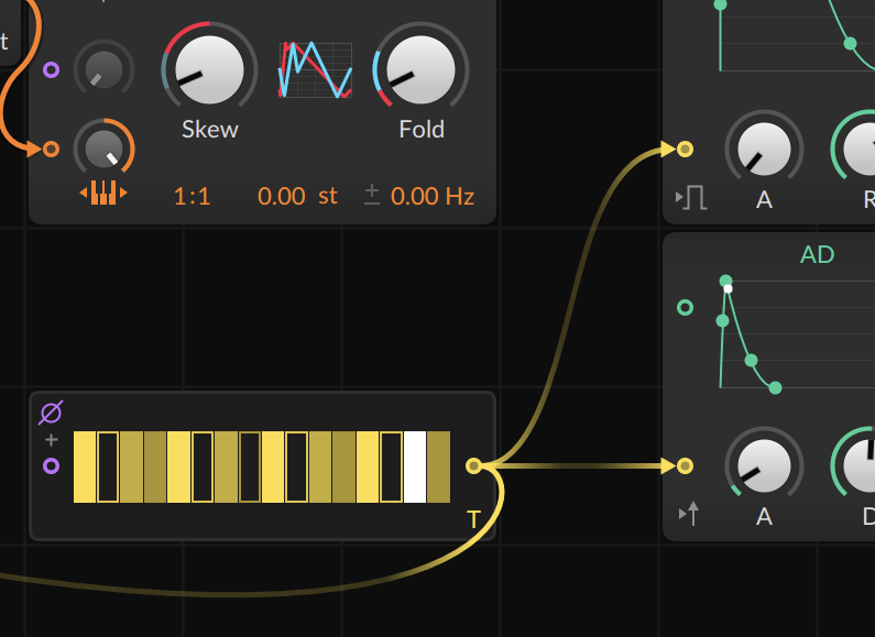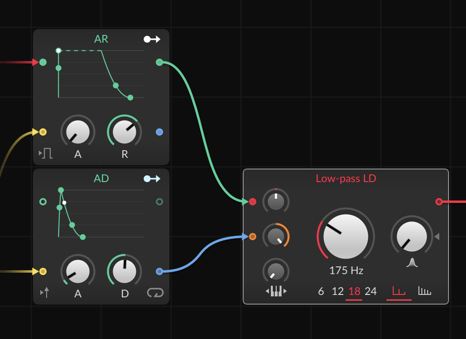 Außerdem machen wir den Klang noch etwas angenehmer: Triangle routen wir in einen AR-Envelope, den wiederum in das Low-pass LD-Filter, welches letztlich in die erste ADSR-Hüllkurve wandert. Dazu verbinden wir einen AD-Envelope mit dem CUTOFF IN des Filters und drehen die Modulation voll auf, CUTOFF selbst wiederum weit zu. Ein klares Plus für den Sound.