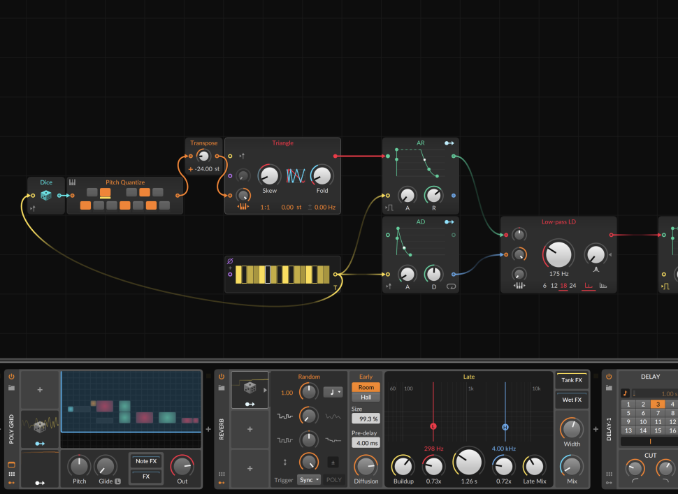 Die neuen Envelopes werden auch vom Gates-Modul getriggert. Wichtig: Bei beiden müssen TRIGGER- bzw. GATE IN deaktiviert werden (mit den Icons links unten auf den Modulen), da sie sonst nur auf eingehende Noten reagieren und nicht auf die Sequenz des Gates-Moduls. Um den Sound schöner zu gestalten, laden wir ein REVERB und DELAY hinter das POLY GRID.