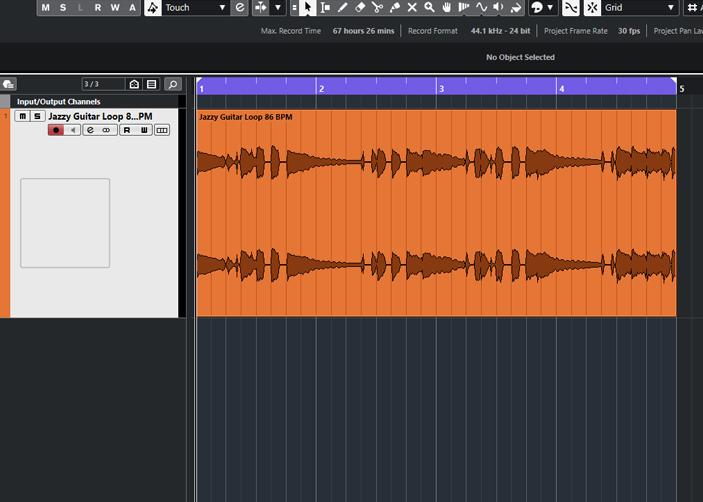 Öffnen Sie zuerst ein neues Projekt mit dem Tempo 86 BPM. Laden Sie die beiliegende Wave-Datei Jazzy Guitar Loop 86 BPM auf Takt 1 in das Projekt. Dies führt dazu, dass automatisch eine Stereo-Audiospur erstellt wird. Markieren Sie anschließend die vier Takte des Audioevents im Lokatorenbereich und aktivieren Sie daraufhin die Loop-Funktion.