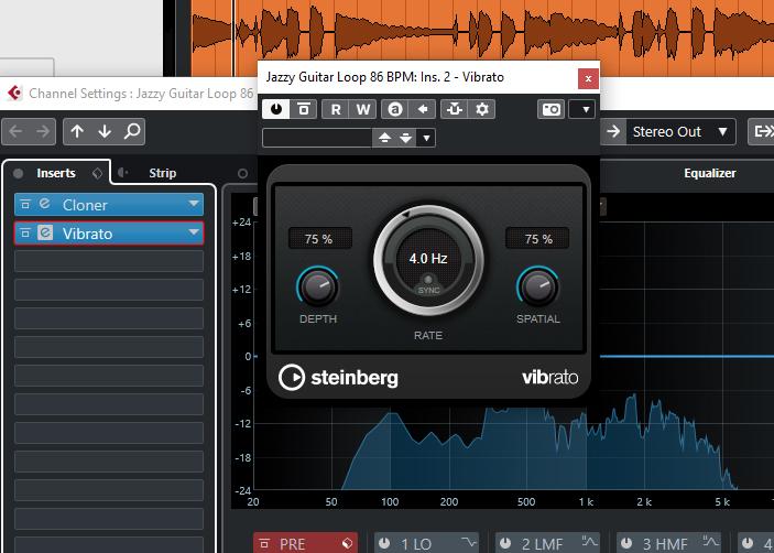 Laden Sie anschließend das Vibrato-Plug-in in den zweiten Insertslot, deaktivieren Sie die Sync-Funktion und stellen Sie den Wert Rate auf 4 Hz. Mit dem Vibrato wollen wir in den folgenden beiden Schritten gezielt das Ausklingen der länger gehaltenen Töne in Bewegung bringen, um einen leicht wabernden Sound der Gitarre entstehen zu lassen.