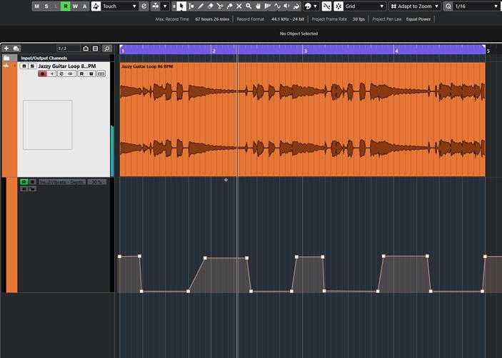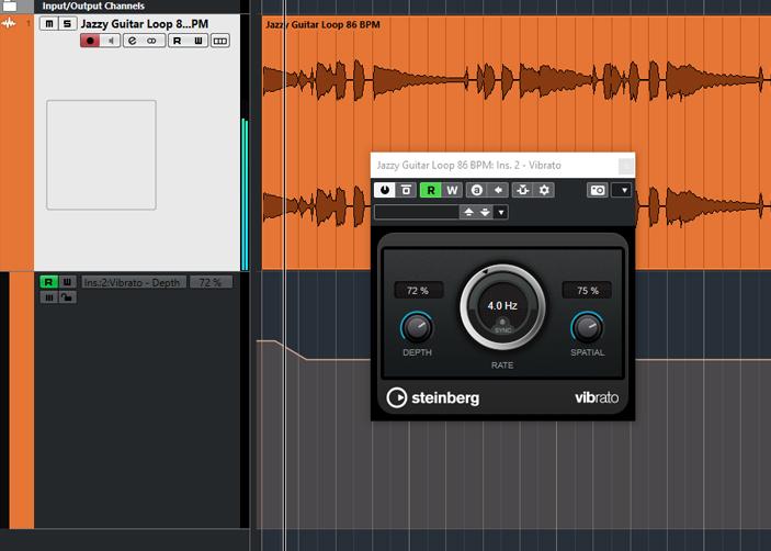 Zeichnen Sie die Automation des Depth-Reglers so ein, dass nur der Ausklang aller lang gehaltenen Töne der Gitarrenspur mit etwa 30% Depth zu hören ist. Achten Sie hierbei darauf, den Depth-Wert mit einer sanften Steigerung bzw. einer Absenkung einzuzeichnen. Auf den schneller gespielten Gitarrentönen ist der Vibrato-Effekt damit nicht zu hören.